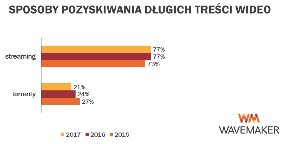 Trzecia edycja VideoTrack potwierdza spadającą popularność torrentów w Polsce. Choć skala piractwa wciąż jest duża, to jednak źródłem pozyskiwania m.in. pirackich treści znacznie częściej są serwisy streamingowe. Badanie Wavemaker dowodzi, że torrenty są stosunkowo najpopularniejsze wśród 25-34 latków (24 proc.), a więc w tej grupie, która rozpoczęła aktywnie korzystanie z wideo w sieci w czasie, gdy oferta serwisów streamingowych nie była jeszcze tak bogata.