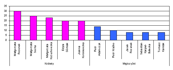 Wykres 1. TOP 5 najczęściej pojawiających się kobiet oraz mężczyzn na okładkach od stycznia do grudnia 2013 r.