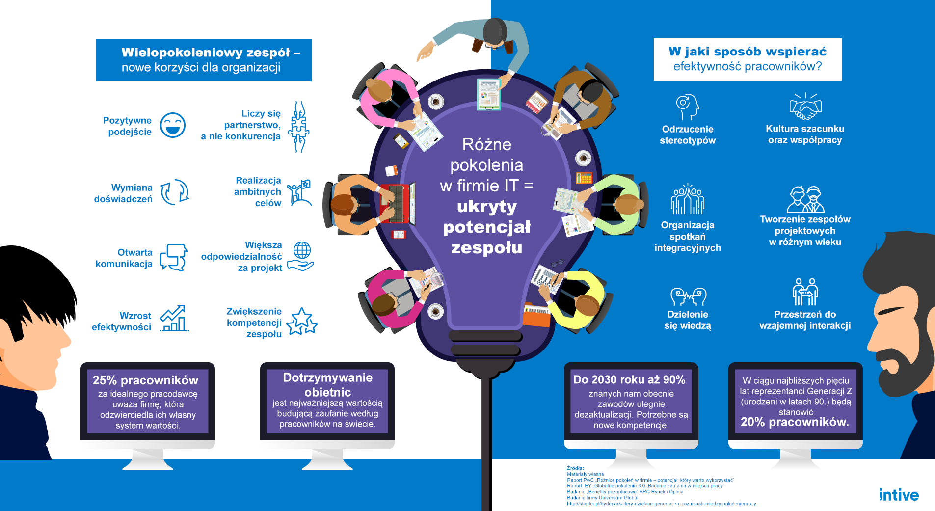 Współpraca pomiędzy przedstawicielami różnych generacji stanie się dla działów HR przedsiębiorstw jednym z najważniejszych wyzwań w najbliższych latach. Wszystko spowodowane jest wszechobecną cyfrową transformacją, która sprawia, że przedstawiciele poszczególnych pokoleń zupełnie inaczej postrzegają wybór pracodawcy oraz swoje obowiązki. Według danych PwC, 69 proc. firm w Europie Środkowo-Wschodniej jest w trakcie zmiany strategii działów HR, co ma docelowo poprawić skuteczność przyciągania talentów do organizacji. Jedną z branż, gdzie już obserwuje się integrację różnych grup wiekowych, jest sektor IT.