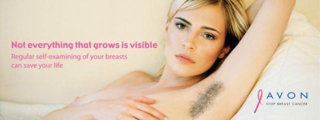 Na koniec baner stworzony przez słowacki oddział producenta kosmetyków, jakim jest Avon. Na fotografii widzimy kobietę zakrywającą jedną pierś, jednocześnie drugą rękę zakładając za głowę… i pokazując pachę porośnięta długimi włosami. Na grafice znalazło się hasło, które dobrze wyjaśnia połączenie włosów z problemem raka piersi: „Nie wszystko, co rośnie, jest widoczne”.