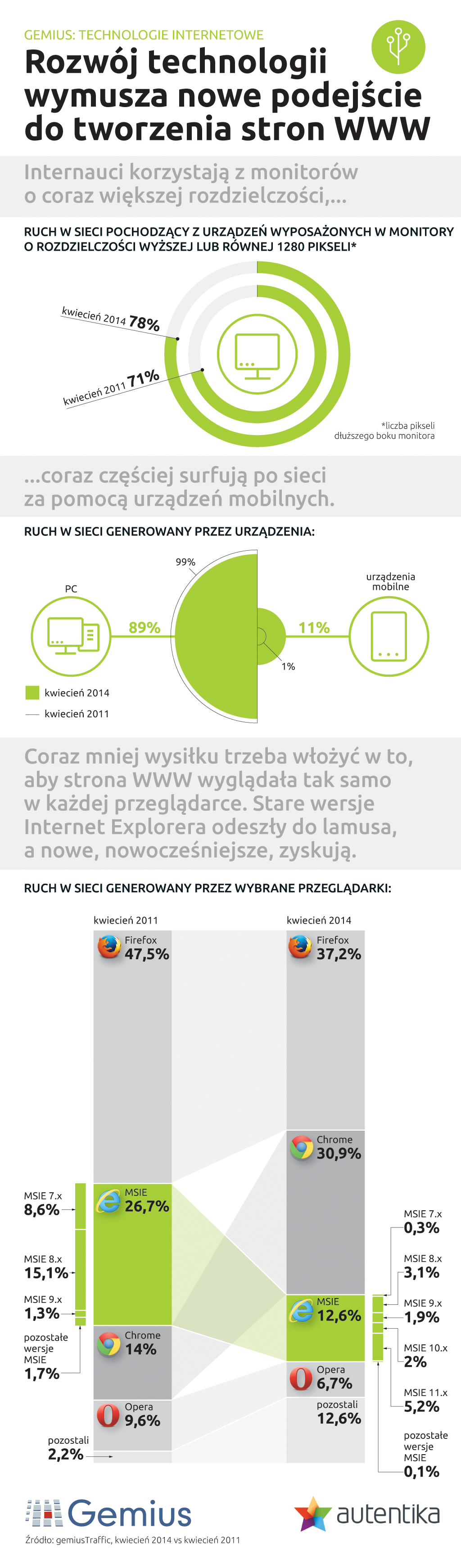 Polscy internauci korzystają z monitorów o coraz większej rozdzielczości i coraz częściej surfują po sieci przy pomocy tabletów czy smartfonów. Ten trend wyznacza nowe standardy tworzenia stron internetowych. W jaki sposób? Odpowiedzi na to pytanie podjęły się firmy Gemius i Autentika.