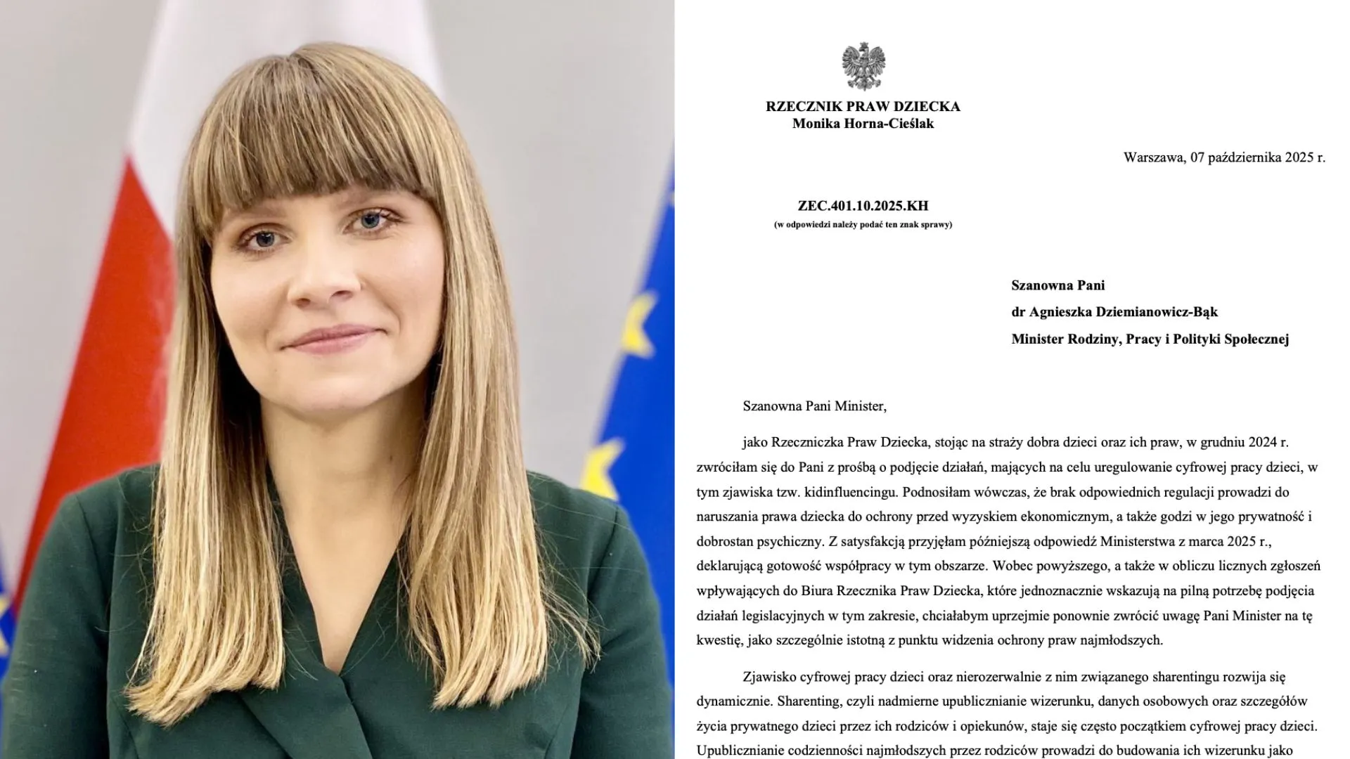 Rzeczniczka Praw Dziecka, Monika Horna-Cieślak, ponawia swój apel do Minister Rodziny Pracy i Polityki Społecznej związany z podjęciem działań, które miałyby uregulować cyfrową pracę dzieci, tzw. zjawisko kidinfluencingu oraz związanego z nim sharentingu.