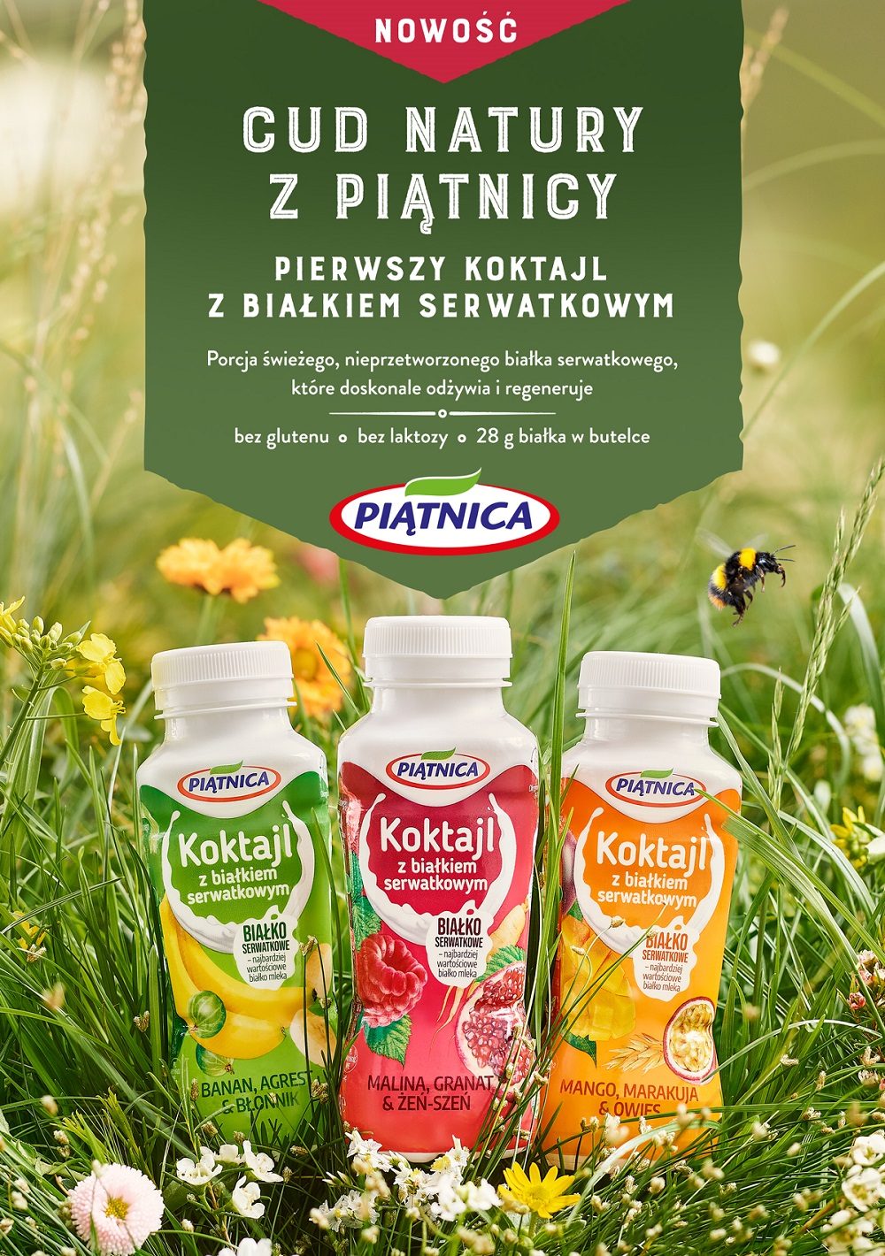 Koktajle z białkiem serwatkowym to nowa kategoria produktów, w których składzie występuje świeże, nieprzetworzone białko serwatkowe, będące najbardziej wartościowym białkiem mleka. Koktajle z białkiem serwatkowym z Piątnicy dostępne są w 3 wariantach smakowych: Malina, granat i żeń-szeń, Mango, marakuja i owies oraz Banan, agrest i błonnik, a każda butelka zawiera aż 28 gramów pełnowartościowego białka. Połączenie świeżego białka serwatkowego i smakowitych owoców czyni z Koktajli unikalną przekąskę – niezwykle smaczną, a równocześnie naturalną, zdrową i odżywczą.