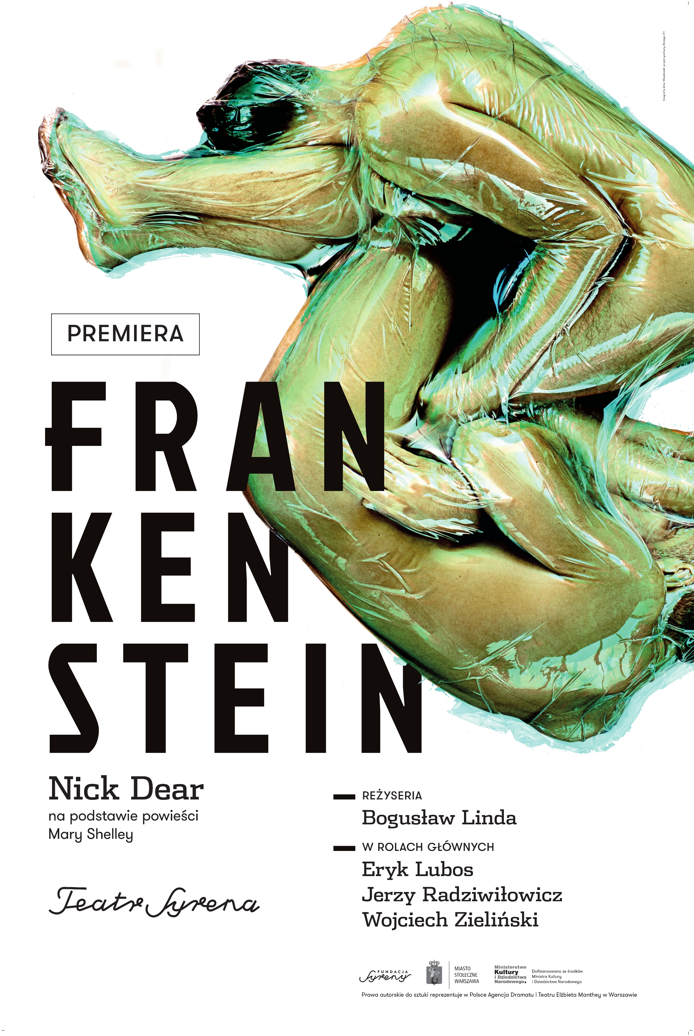 „Frankenstein”, najnowsza premiera Teatru Syrena, to jedna z najbardziej widowiskowych produkcji w Polsce w ostatnich latach. Reżyseria spektaklu jest dziełem Bogusława Lindy. W obsadzie zobaczymy m.in.: Eryka Lubosa, Jerzego Radziwiłowicza, Tomasza Sapryka i Wojciecha Zielińskiego. Zespół twórców to utytułowani, wybitni realizatorzy teatralni i filmowi, m.in.: Michał Lorenc (muzyka), Jagna Janicka (scenografia) Tomasz Matraszek, Katarzyna Łuszczyk (reżyseria światła) i Jarosław Staniek (choreografia).