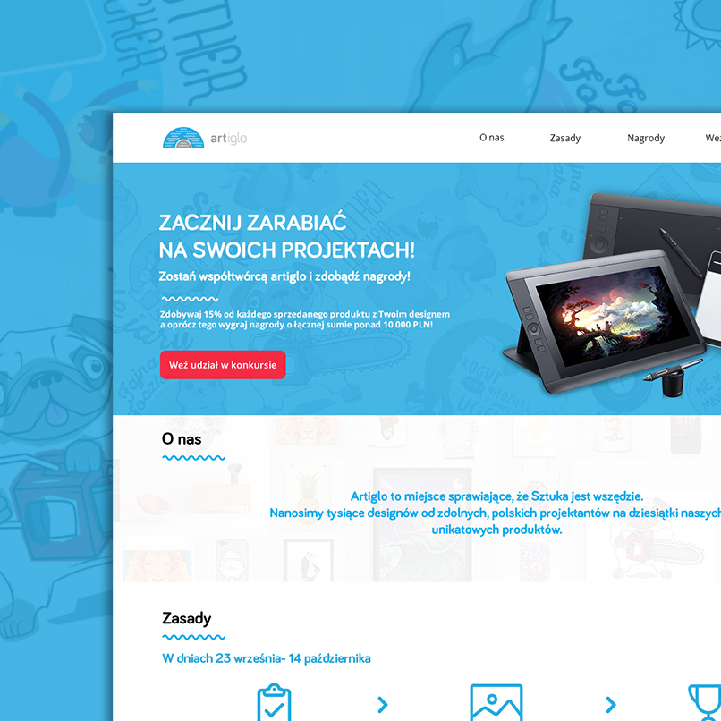 Twórcy Artiglo stawiają na współpracę z polskimi grafikami i fotografami, oferując im atrakcyjne wynagrodzenie w postaci 15 proc. prowizji od każdego sprzedanego produktu z ich projektem. Już dziś, do dyspozycji użytkowników jest kilka tysięcy projektów, jednak docelowo ma ich być dużo więcej. By poszerzyć ofertę i zachęcić artystów do współpracy ruszył specjalny konkurs zorganizowany wspólnie z WACOM i Graficznie.pl. Autorzy najlepszych designów przesłanych do Artiglo w okresie od 8 do 29 października poza standardową prowizją otrzymają m.in. profesjonalne tablety graficzne (więcej na www.artiglo.pl/konkurs).