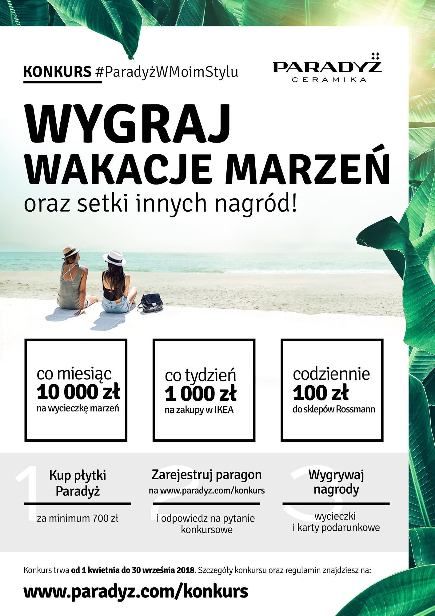 Filarem kampanii jest konkurs dla Klientów. Po zakupie produktów Ceramiki Paradyż Klienci mogą wziąć udział w losowaniu nagród, rejestrując swój paragon na stronie www.paradyz.com/konkurs/. Co miesiąc firma rozda 1 voucher o wartości 10 000 na wakacje marzeń, co tydzień 1000 zł na zakupy w IKEA a codziennie 100 zł na zakupy w sklepach Rossmann.