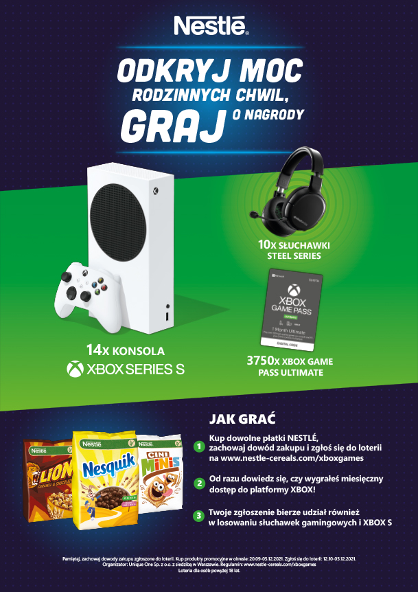 Aby wziąć udział w loterii, należy kupić jednorazowo, w okresie sprzedaży promocyjnej, co najmniej jedno opakowanie dowolnych płatków śniadaniowych marki Nestlé. W loterii biorą udział wszystkie wymienione w regulaminie produkty marki Nestlé, niezależnie od tego, czy na zewnętrznej stronie opakowania posiadają informację o loterii, czy też nie. Po dokonaniu zakupu, kupujący zgłasza dane z paragonu potwierdzającego zakup na stronie nestle-cereals.com/xboxgames