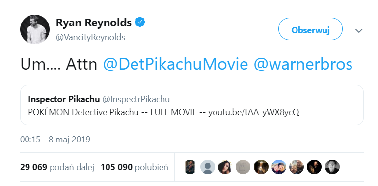 Na swoim profilu na Twitterze aktor zamieścił link do całego filmu opublikowanego na YouTubie. Jak się prędko okazało, Reynolds postanowił strollować swoich fanów, bowiem wideo wcale nie jest wyciekiem „Detektywa Pikachu” – wszyscy Ci, którzy postanowili kliknąć w udostępniony przez aktora link, mogli przez ponad półtorej godziny podziwiać tańczącego Pikachu 😉