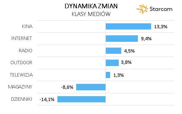 W czterech kwartałach 2016 r. najwyższą wzrostową dynamikę wpływów reklamowych (+13,3 proc.) odnotowało kino. Rosły także wydatki w internecie (+9,4 proc.), radiu (+4,5 proc.), reklamie zewnętrznej (+3,8 proc.) i telewizji (+1,3 proc.). Zgodnie z wieloletnim trendem spadły wydatki reklamowe w magazynach (-8,6 proc.) oraz dziennikach (-14,1 proc.).