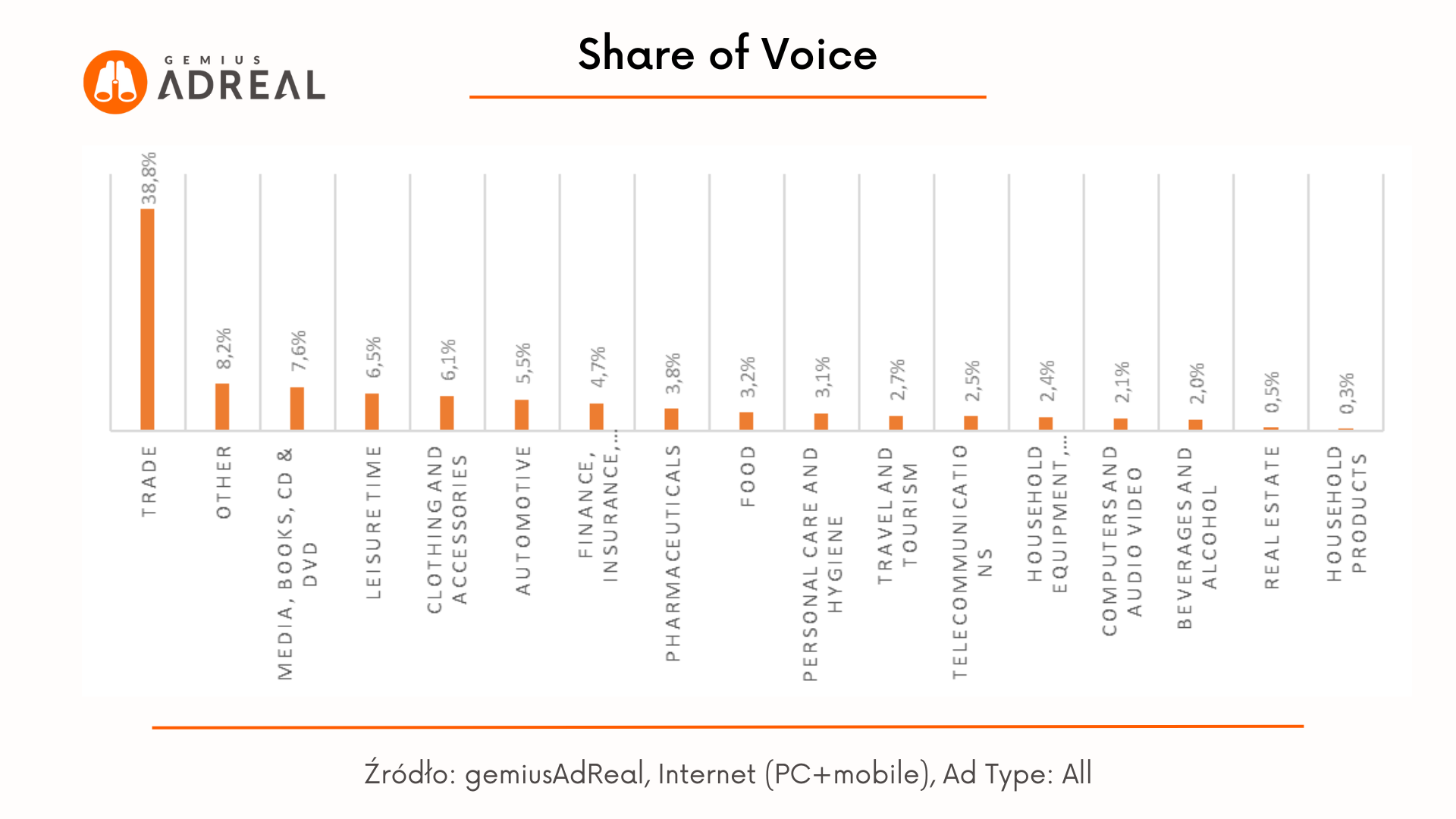 Na kolejnych miejscach podium znalazły się branże „Media, books, CD&DVD (5,8 mld kontaktów reklamowych i SoV na poziomie 7,6%) oraz Leisure Time (4,6 mld kontaktów reklamowych i SoV – 6,5%).