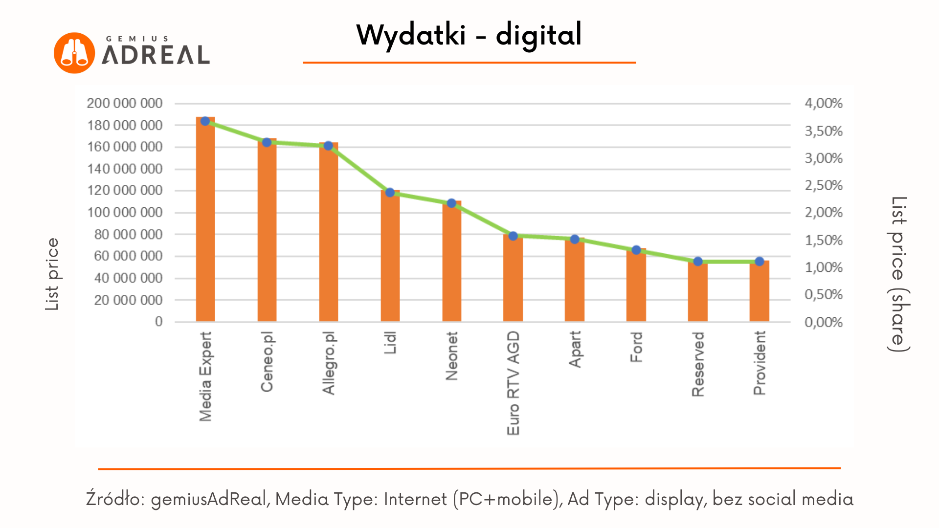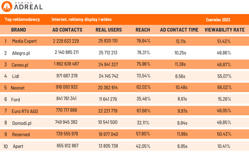 Najbardziej aktywnym reklamodawcą digital w czerwcu 2023 była marka Media Expert, która wygenerowała 2,2 mld kontaktów reklamowych online, docierając do 78,64% Polaków w wieku od 7 do 75 lat. Na drugim miejscu znalazło się Allegro.pl z 2,1 mld kontaktów i 78,31% zasięgu. Trzecie miejsce na podium należało do Ceneo.pl (1,9 mld kontaktów i zasięg na poziomie 76%).
