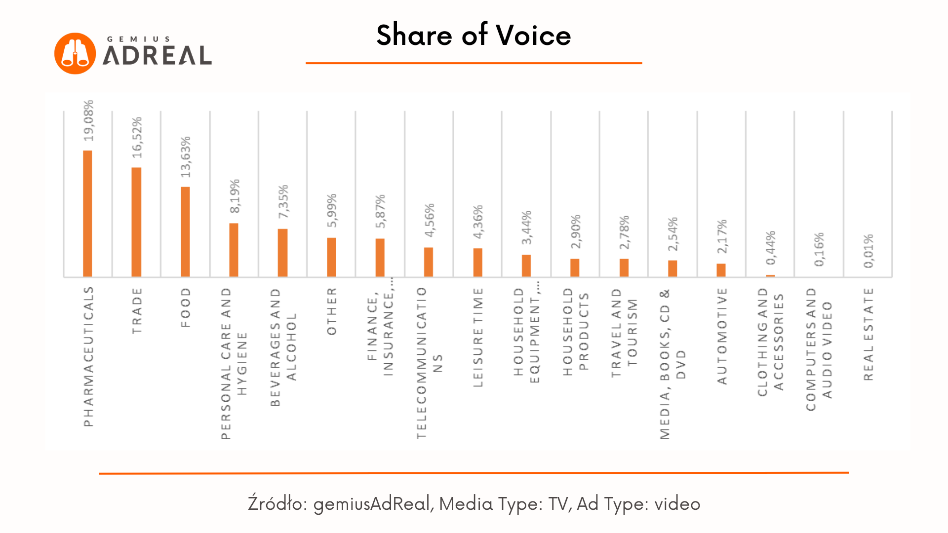 W czerwcu w telewizji najbardziej aktywna reklamowo była branża „Pharmaceuticals”, która wyprzedziła branżę „Trade”. Wygenerowała ona ponad 11,2 mld kontaktów reklamowych, docierając do 94,43% populacji w wieku od 7 do 75 lat. Share of Voice we wszystkich kontaktach reklamowych w czerwcu wyniósł dla tej branży 19,08%, natomiast średni czas kontaktu z reklamą w tradycyjnym odbiorniku – 18,10 sekundy. Na drugim miejscu znalazła się branża „Trade” (9,7 mld kontaktów reklamowych, SoV na poziomie 16,52% oraz 94,27% zasięgu), podium zamyka natomiast branża Food (8 mld kontaktów reklamowych, SoV – 13,63% i zasięg – 93,85%).
