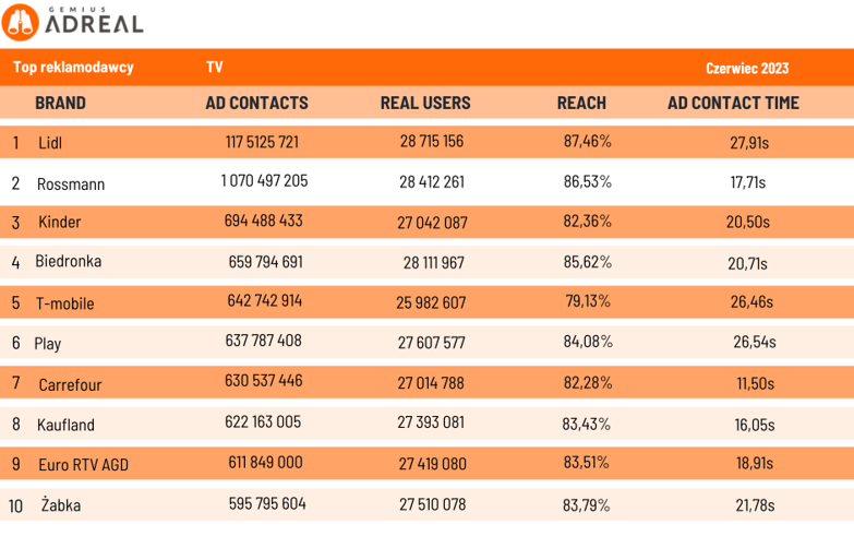 Najbardziej aktywnym reklamodawcą w telewizji w czerwcu – podobnie jak w kwietniu oraz maju – była marka Lidl. Wygenerowała ona 1,18 mld kontaktów reklamowych, docierając do 87,5% Polaków w wieku od 7 do 75 lat. Na drugim miejscu znalazł się Rossmann (1 mld kontaktów reklamowych i 86,53% zasięgu), natomiast na trzecim – Kinder (694 mln kontaktów i 82,36% zasięgu). Na 10. miejscu prezentowanego rankingu znalazła się Żabka z 595,8 mln kontaktów reklamowych i 83,79% zasięgu w populacji 7-75.