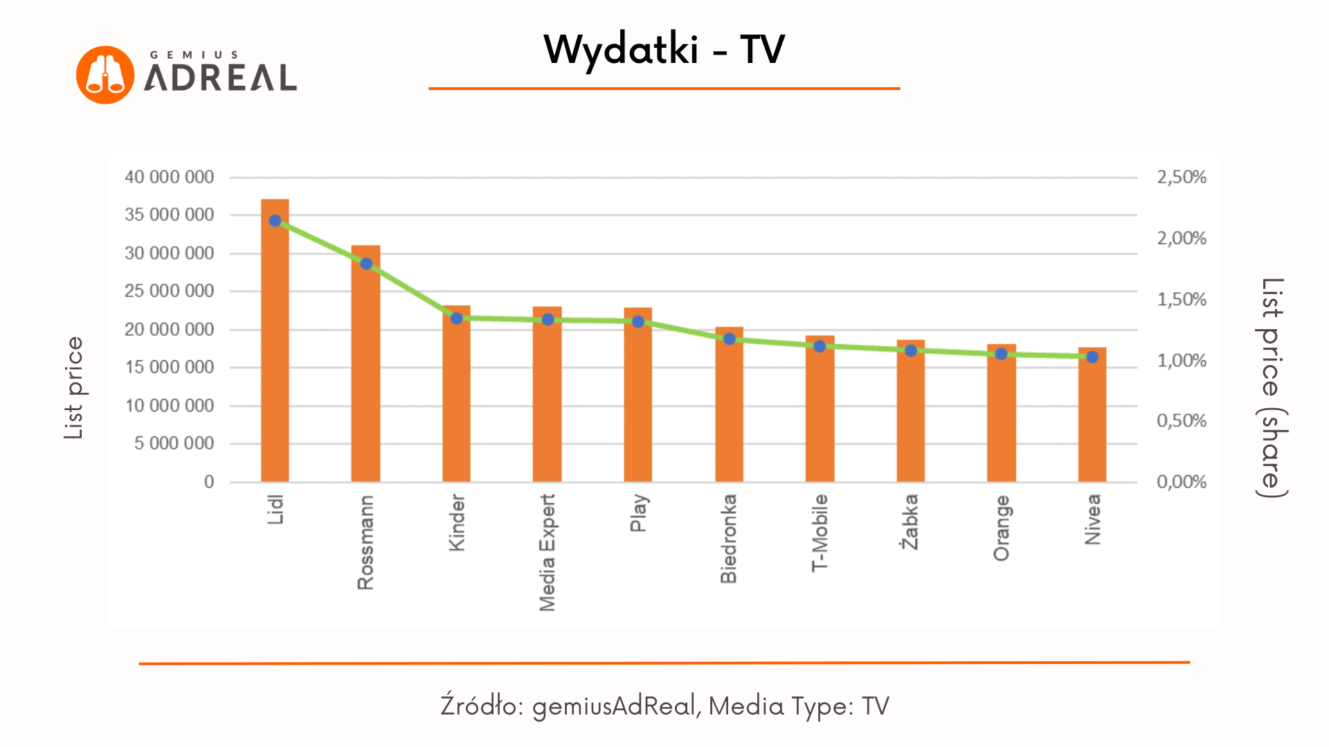 Pod względem estymowanych wydatków reklamowych w telewizji na pierwszym miejscu znalazła się marka Lidl – jej udział w wydatkach wyniósł 2,32% – a na drugim Rossmann, z udziałem na poziomie 1,94%. Trzecie miejsce należało do Kinder, z udziałem 1,45%.