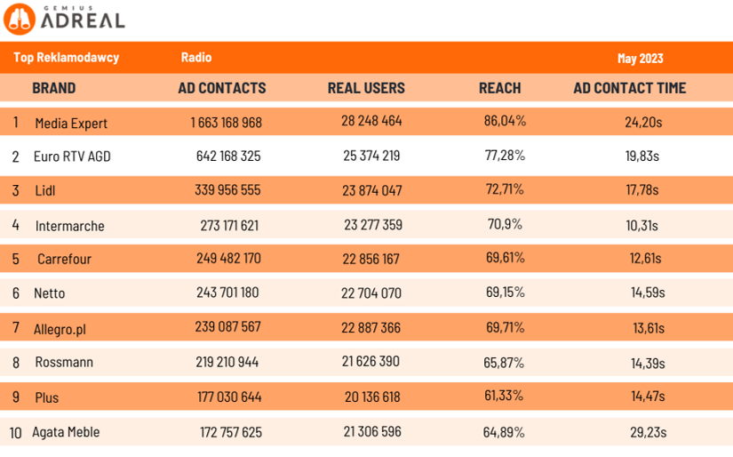 Najbardziej aktywnym reklamodawcą w radiu w czerwcu była marka Media Expert – wygenerowała ona 1,66 mld kontaktów reklamowych, docierając do 86,04% Polaków w wieku od 7 do 75 lat. Na drugim miejscu znalazł się Euro RTV AGD (642 mld kontaktów reklamowych, 77,28% zasięgu), na trzecim – Lidl (339,9 mln kontaktów, 72,71% zasięgu). Zestawienie TOP 10 zamyka Agata Meble (172,75 mln kontaktów i 64,89% zasięgu).