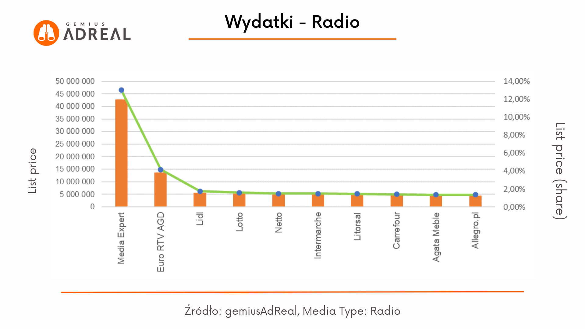 Najwyższy udział w wydatkach reklamowych w radiu miała w czerwcu marka Media Expert (11,99%). Kolejne miejsca należą do Euro RTV AGD (3,82%) oraz Lidl (1,60%).