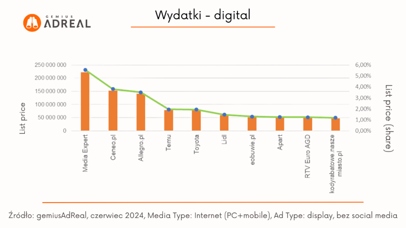 Najbardziej aktywnym reklamodawcą digital w czerwcu 2024 została marka Media Expert, która wygenerowała 3,43 mld kontaktów reklamowych online, docierając do 78,52% Polaków w wieku od 7 do 75 lat. Na drugim miejscu znalazło się Temu z 2,66 mld kontaktów i 75,70% zasięgu. Trzecie miejsce na podium należało do Allegro.pl (2,57 mld kontaktów i zasięg na poziomie 77,92%). Ranking TOP 10 marek zamyka Zalando, które odnotowało 0,56 mld kontaktów reklamowych.