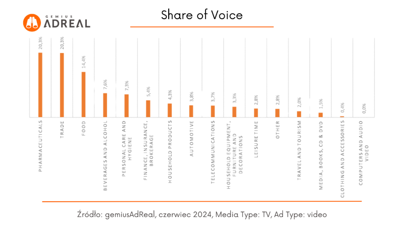 W czerwcu w telewizji najbardziej aktywna reklamowo była branża „Pharmaceuticals”. Wygenerowała ona ponad 13,2 mld kontaktów reklamowych, docierając do 92,83% populacji w wieku od 7 do 75 lat. Share of Voice we wszystkich kontaktach reklamowych w czerwcu wyniósł dla tej branży 20,3%, natomiast średni czas kontaktu z reklamą w tradycyjnym odbiorniku – 21,05 sekundy. Na drugim miejscu znalazła się branża „Trade” (13,19 mld kontaktów reklamowych, SoV na poziomie 20,3% oraz 93,35% zasięgu), podium zamyka natomiast branża Food (9,34 mld kontaktów reklamowych, SoV – 14,4% i zasięg – 92,88%).