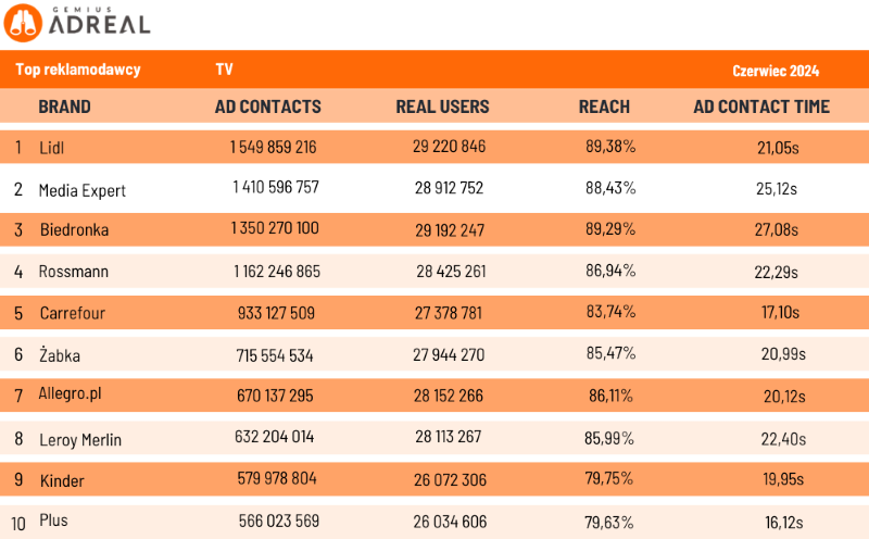 Najbardziej aktywnym reklamodawcą w telewizji w czerwcu była marka Lidl. Wygenerowała ona 1,55 mld kontaktów reklamowych, docierając do 89,38% Polaków w wieku od 7 do 75 lat. Na drugim miejscu znalazł się Media Expert (1,41 mld kontaktów reklamowych i 88,43% zasięgu), natomiast na trzecim – Biedronka (1,35 mld kontaktów i 89,29% zasięgu). Na 10. miejscu prezentowanego rankingu uplasowała się marka Plus z 0,57 mld kontaktów reklamowych i 79,63% zasięgu w populacji 7-75.