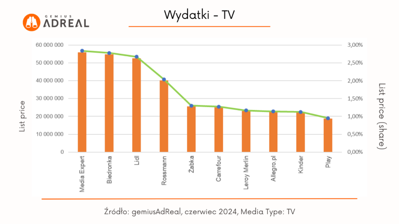Pod względem estymowanych wydatków reklamowych w telewizji na pierwszym miejscu znalazła się marka Media Expert – jej udział w wydatkach wyniósł 2,79% – a na drugim Biedronka, z udziałem na poziomie 2,74%. Trzecie miejsce należało do marki Lidl, z udziałem 2,63%.