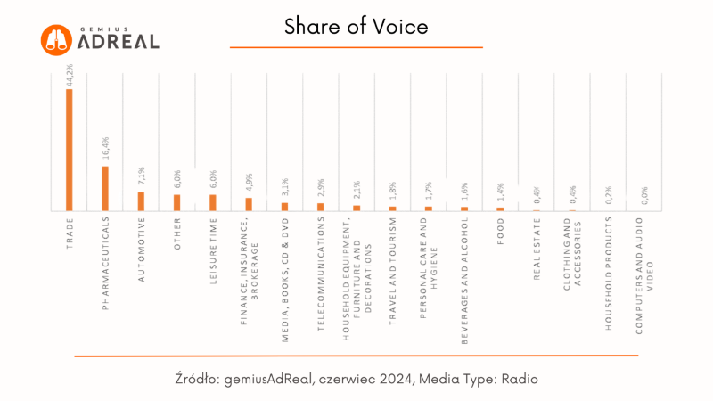 W radiu branżą o największej liczbie kontaktów reklamowych w czerwcu była branża „Trade” (11,5 mld). Na drugim i trzecim miejscu znalazły się branże „Pharmaceuticals” (4,27 mld kontaktów) oraz „Automotive” (1,84 mld kontaktów reklamowych).