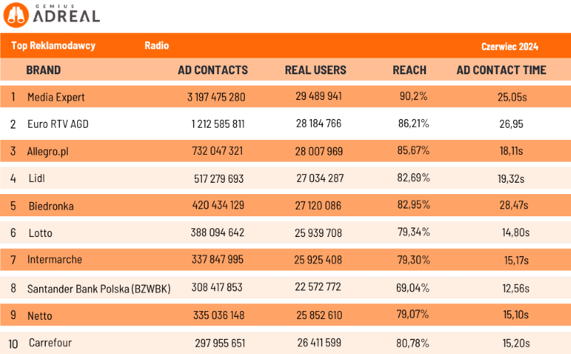 Najbardziej aktywnym reklamodawcą w radiu w czerwcu była ponownie marka Media Expert – wygenerowała ona 3,2 mld kontaktów reklamowych, docierając do 90,20% Polaków w wieku od 7 do 75 lat. Na drugim miejscu znalazło się RTV Euro AGD (1,21 mld kontaktów reklamowych, 86,21% zasięgu), na trzecim – Allegro.pl (0,73 mld kontaktów, 85,67% zasięgu). Zestawienie TOP 10 zamyka marka Carrefour (0,3 mld kontaktów i 80,78% zasięgu).