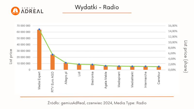 Najwyższy udział w wydatkach reklamowych w radiu miała w czerwcu marka Media Expert (14,59%). Kolejne miejsca należą do RTV Euro AGD (5,54%) oraz Allegro.pl (2,53%).