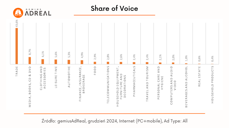 Najbardziej aktywna pod względem liczby kontaktów reklamowych online była branża „Trade” (40,21 mld), dla której Share of Voice we wszystkich kontaktach reklamowych online w grudniu wyniósł 43,6%. Średni czas kontaktu dla tej branży wyniósł 9,43 sekundy, a wskaźnik widoczności kreacji – 48.23%.