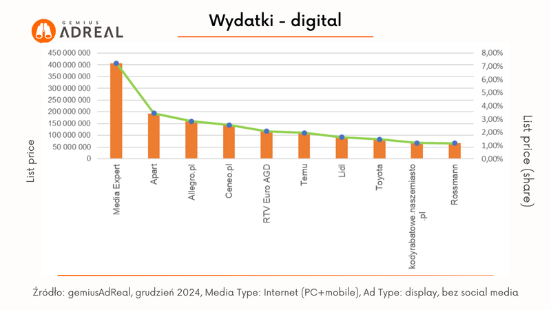 Na pierwszym miejscu zestawienia wydatków reklamowych display w grudniu 2024 znalazła się marka Media Expert – jej udział w wydatkach wśród wszystkich marek wyniósł 7,22%. Na drugim miejscu uplasowała się marka Apart z 3,44% udziału, natomiast podium zamyka Allegro.pl (2,84% udziału).