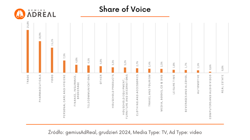 W grudniu w telewizji najbardziej aktywna reklamowo była branża „Trade”. Wygenerowała ona 17,09 mld kontaktów reklamowych, docierając do 93,64% populacji w wieku od 7 do 75 lat. Share of Voice we wszystkich kontaktach reklamowych w grudniu wyniósł dla tej branży 25,8%, natomiast średni czas kontaktu z reklamą w tradycyjnym odbiorniku – 19,94 sekundy. Na drugim miejscu znalazła się branża „Pharmaceuticals” (12,57 mld kontaktów reklamowych, SoV na poziomie 18,9% oraz 93,12% zasięgu), podium zamyka natomiast branża „Food” (10,01 mld kontaktów reklamowych, SoV – 15,1% i zasięg – 92,91%).
