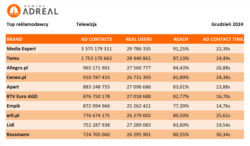 Najbardziej aktywnym reklamodawcą digital w grudniu 2024 został Media Expert, który wygenerował 5,2 mld kontaktów reklamowych online, docierając do 81,54% Polaków w wieku od 7 do 75 lat. Na drugim miejscu znalazła się marka Temu z 4,2 mld kontaktów i 80,04% zasięgu. Trzecie miejsce na podium należało do Allegro.pl (2,85 mld kontaktów i zasięg na poziomie 80,81%). Ranking TOP 10 marek zamyka Rossmann, który odnotował 0,85 mld kontaktów reklamowych.