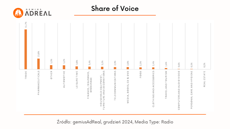 W radiu branżą o największej liczbie kontaktów reklamowych w grudniu była branża „Trade” (13,09 mld). Na drugim i trzecim miejscu znalazły się branże „Pharmaceuticals” (3,5 mld kontaktów) oraz „Automotive” (1,32 mld kontaktów reklamowych).