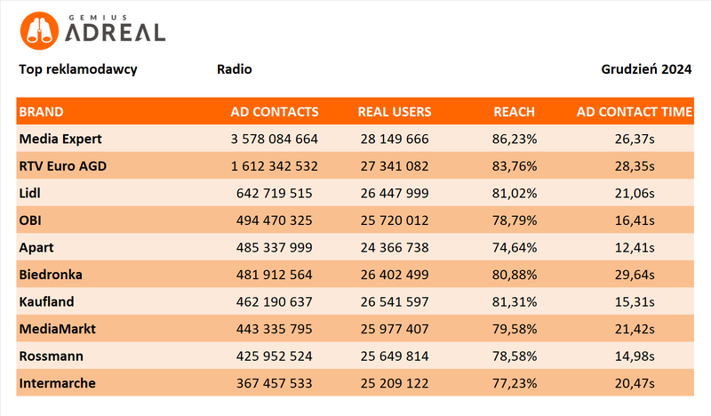 Najbardziej aktywnym reklamodawcą w radiu w grudniu była ponownie marka Media Expert – wygenerowała ona 3,58 mld kontaktów reklamowych, docierając do 86,23% Polaków w wieku od 7 do 75 lat. Na drugim miejscu znalazło się RTV Euro AGD (1,61 mld kontaktów reklamowych, 83,76% zasięgu), na trzecim – Lidl (0,64 mld kontaktów, 81,02% zasięgu). Zestawienie TOP 10 zamyka marka Intermarche (0,37 mld kontaktów i 77,23% zasięgu).