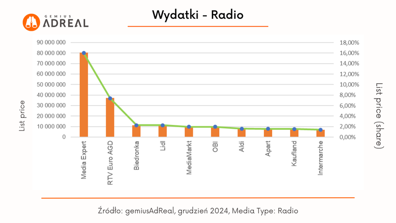 Najwyższy udział w wydatkach reklamowych w radiu miała w grudniu marka Media Expert (16,10%). Kolejne miejsca należą do RTV Euro AGD (7,43%) oraz Biedronka (2,26%).