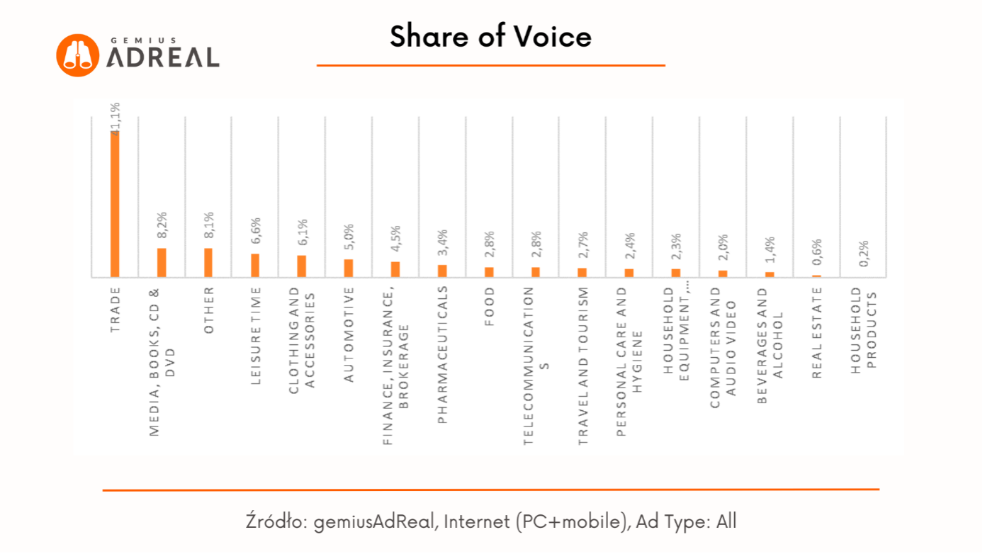 Najbardziej aktywna pod względem liczby kontaktów reklamowych online była branża „Trade” (29,4 mld), dla której Share of Voice we wszystkich kontaktach reklamowych online w kwietniu wyniósł 41,1%. Średni czas kontaktu dla tej branży wyniósł 10,15 sekundy, a wskaźnik widoczności kreacji – 51,6%.