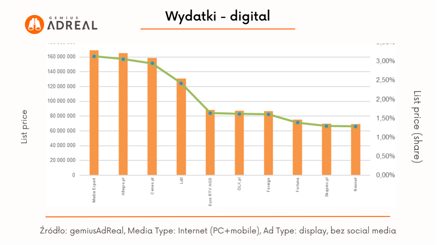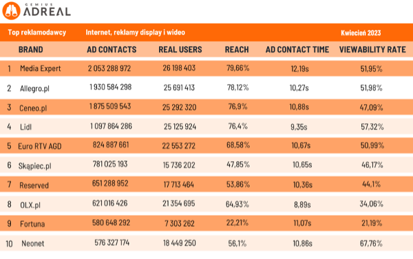 Najbardziej aktywnym reklamodawcą digital w kwietniu 2023 była marka Media Expert, która wygenerowała 2 mld kontaktów reklamowych online, docierając do 79,7% Polaków w wieku od 7 do 75 lat. Na drugim miejscu znalazło się Allegro.pl z 1,9 mld kontaktów i 78,1% zasięgu. Trzecie miejsce na podium należało do Ceneo.pl (1,9 mld kontaktów i zasięg na poziomie 76,9%).