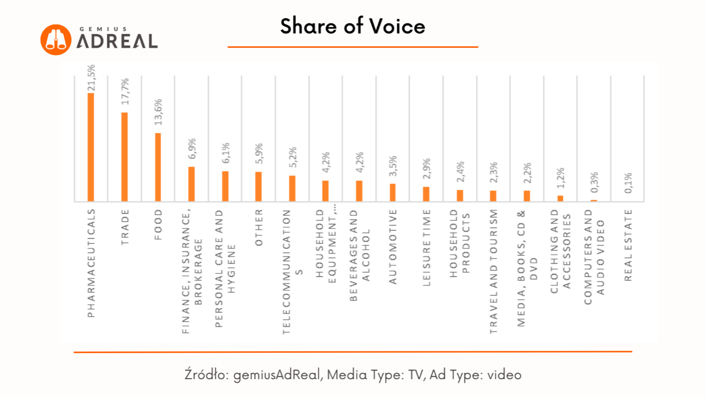 W kwietniu w telewizji najbardziej aktywna reklamowo była branża „Pharmaceuticals”. Wygenerowała ona ponad 14,3 mld kontaktów reklamowych, docierając do 95,1% populacji w wieku od 7 do 75 lat. Share of Voice we wszystkich kontaktach reklamowych w marcu wyniósł dla tej branży 21,5%, natomiast średni czas kontaktu z reklamą w tradycyjnym odbiorniku – 18,7 sekundy. Na drugim miejscu znalazła się branża „Trade” (11,8 mld kontaktów reklamowych, SoV na poziomie17,7% oraz 95,3% zasięgu), podium zamyka natomiast branża Food (9 mld kontaktów reklamowych, SoV – 13,6% i zasięg – 95%).