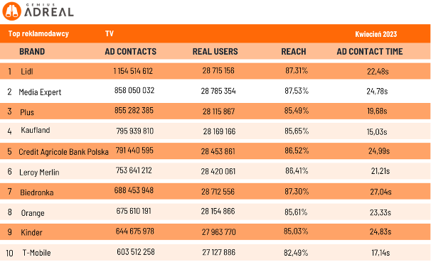 Najbardziej aktywnym reklamodawcą w telewizji w kwietniu – podobnie jak w marcu – była marka Lidl. Wygenerowała ona 1,2 mld kontaktów reklamowych, docierając do 87,3% Polaków w wieku od 7 do 75 lat. Na drugim miejscu znalazł się Media Expert (858 mln kontaktów reklamowych i 87,5% zasięgu), natomiast na trzecim – Plus (855 mln kontaktów i 86,5% zasięgu). Na 10. miejscu prezentowanego rankingu znalazł się T-Mobile z 603,5 mln kontaktów reklamowych i 82,5% zasięgu w populacji 7-75.