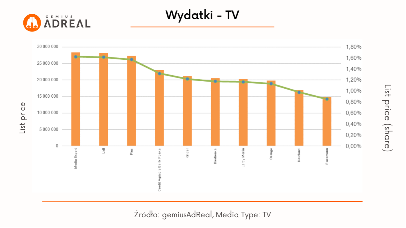 Pod względem estymowanych wydatków reklamowych w telewizji na pierwszym miejscu znalazła się marka Media Expert – jej udział w wydatkach wyniósł 1,7% – a na drugim Lidl, z udziałem na poziomie 1,69%. Trzecie miejsce należało do banku PKO BP z udziałem 1,6%.