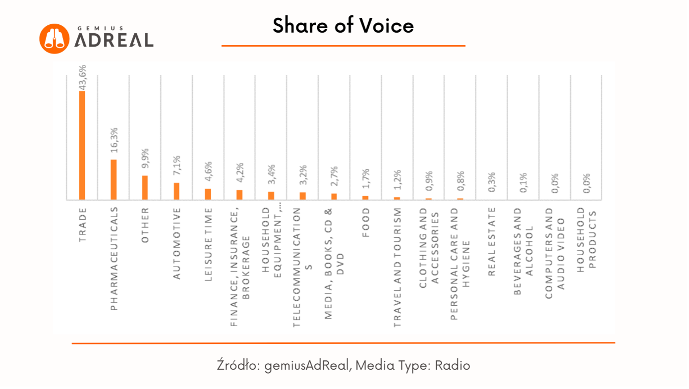 W radiu branżą o największej liczbie kontaktów reklamowych w kwietniu była branża „Trade” (7,7 mld kontaktów reklamowych). Na drugim i trzecim miejscu znalazły się branże „Pharmaceuticals” (2,9 mld kontaktów) oraz „Automotive” (1,2 mld kontaktów).