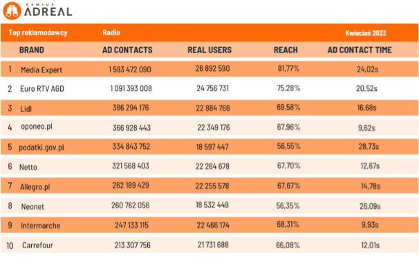 Najbardziej aktywnym reklamodawcą w radiu w kwietniu była marka Media Expert – wygenerowała ona 1,6 mld kontaktów reklamowych, docierając do 81,8% Polaków w wieku od 7 do 75 lat. Na drugim miejscu znalazł się Euro RTV AGD (1,1 mld kontaktów reklamowych, 75,3% zasięgu), na trzecim – Lidl (386,3 mln kontaktów, 69,6% zasięgu). Zestawienie TOP 10 zamykają markety Intermarche (247,1 mln kontaktów i 68,3% zasięgu) oraz Carrefour (213,3 mln kontaktów, 66,1% zasięgu).