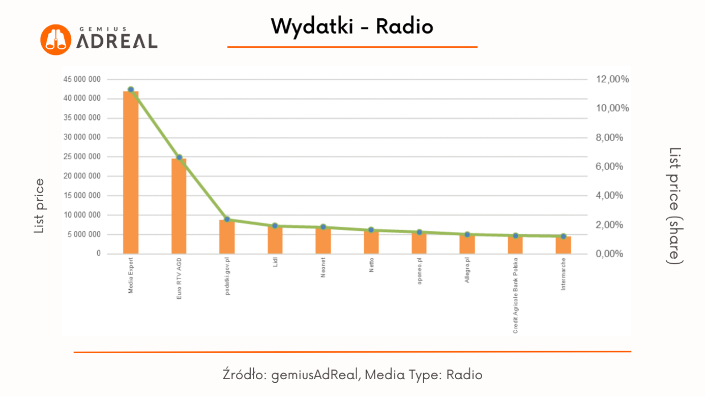 Najwyższy udział w wydatkach reklamowych w radiu miała w kwietniu marka Media Expert (11,2%). Kolejne miejsca należą do Euro RTV AGD (6,6%) oraz portalu podatki.gov.pl (2,35%). Na 10 miejscu zestawienia znalazł się Intermarche z udziałem 1,2% w wydatkach reklamowych.