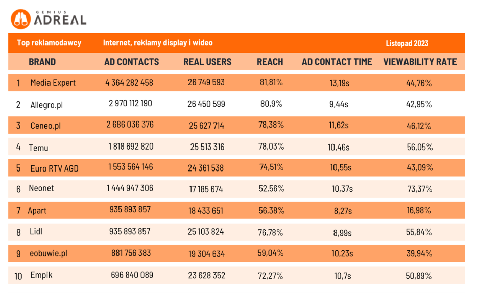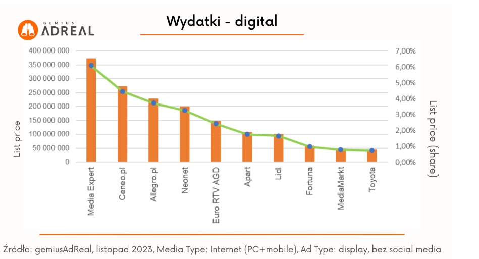 Najbardziej aktywnym reklamodawcą digital w listopadzie 2023 była marka Media Expert, która wygenerowała 4,36 mld kontaktów reklamowych online, docierając do 81,8% Polaków w wieku od 7 do 75 lat. Na drugim miejscu znalazło się Allegro.pl z 2,97 mld kontaktów i 80,9% zasięgu. Trzecie miejsce na podium należało do Ceneo.pl (2,69 mld kontaktów i zasięg na poziomie 78,4%).