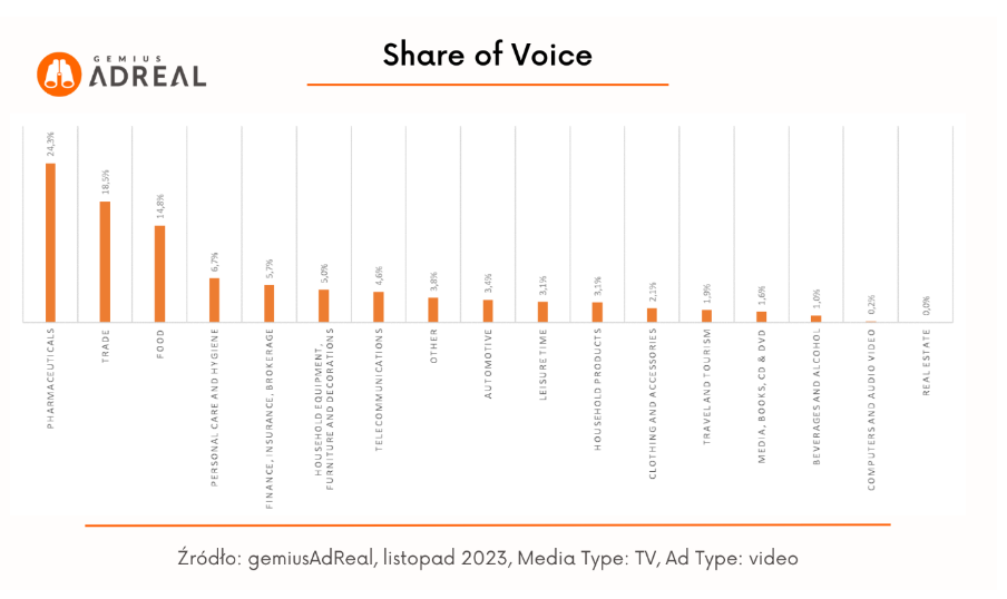 W listopadzie w telewizji najbardziej aktywna reklamowo była branża „Pharmaceuticals”, która ponownie wyprzedziła branżę „Trade”. Wygenerowała ona ponad 17,6 mld kontaktów reklamowych, docierając do 93,19% populacji w wieku od 7 do 75 lat. Share of Voice we wszystkich kontaktach reklamowych w listopadzie wyniósł dla tej branży 24,3%, natomiast średni czas kontaktu z reklamą w tradycyjnym odbiorniku – 18,05 sekundy. Na drugim miejscu znalazła się branża „Trade” (13,4 mld kontaktów reklamowych, SoV na poziomie 18,5% oraz 93,40% zasięgu), podium zamyka natomiast branża Food (10,74 mld kontaktów reklamowych, SoV – 14,8% i zasięg – 93,10%).