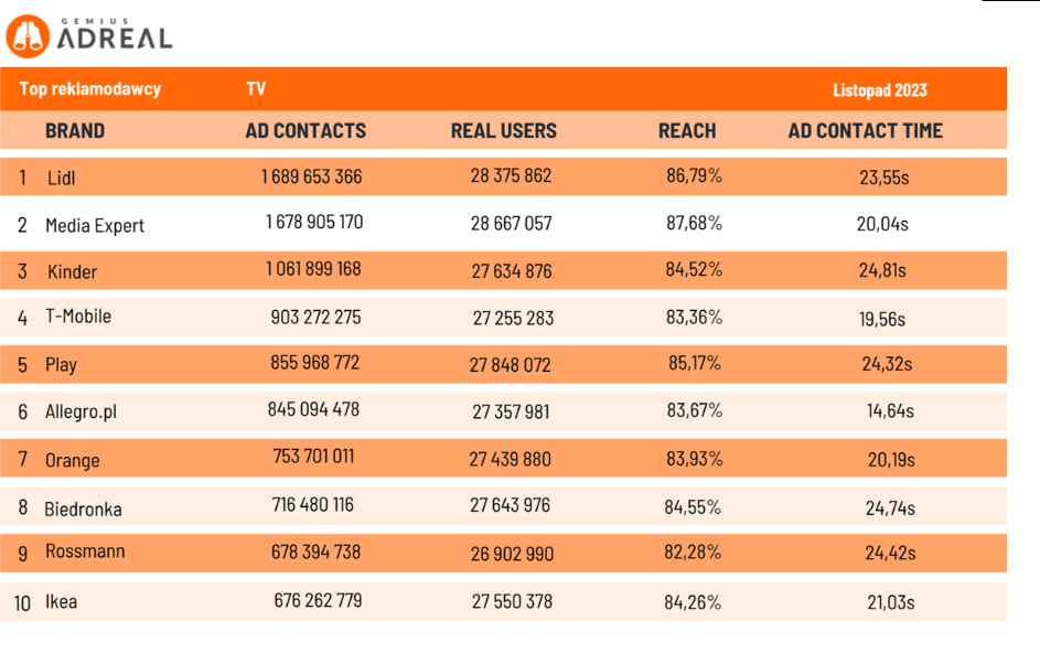 Najbardziej aktywnym reklamodawcą w telewizji w listopadzie była marka Lidl. Wygenerowała ona 1,69 mld kontaktów reklamowych, docierając do 86,79% Polaków w wieku od 7 do 75 lat. Na drugim miejscu znalazł się Media Expert (1,68 mld kontaktów reklamowych i 87,68% zasięgu), natomiast na trzecim – Kinder (1,06 mld kontaktów i 84,52% zasięgu). Na 10. miejscu prezentowanego rankingu uplasowała się marka IKEA z 0,68 mld kontaktów reklamowych i 84,26% zasięgu w populacji 7-75.