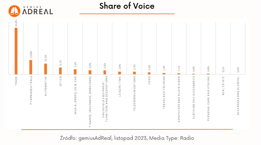 W radiu branżą o największej liczbie kontaktów reklamowych w listopadzie była branża „Trade” (11,6 mld). Na drugim i trzecim miejscu znalazły się branże „Pharmaceuticals” (3,6 mld kontaktów) oraz „Automotive” (2,7 mld kontaktów reklamowych).