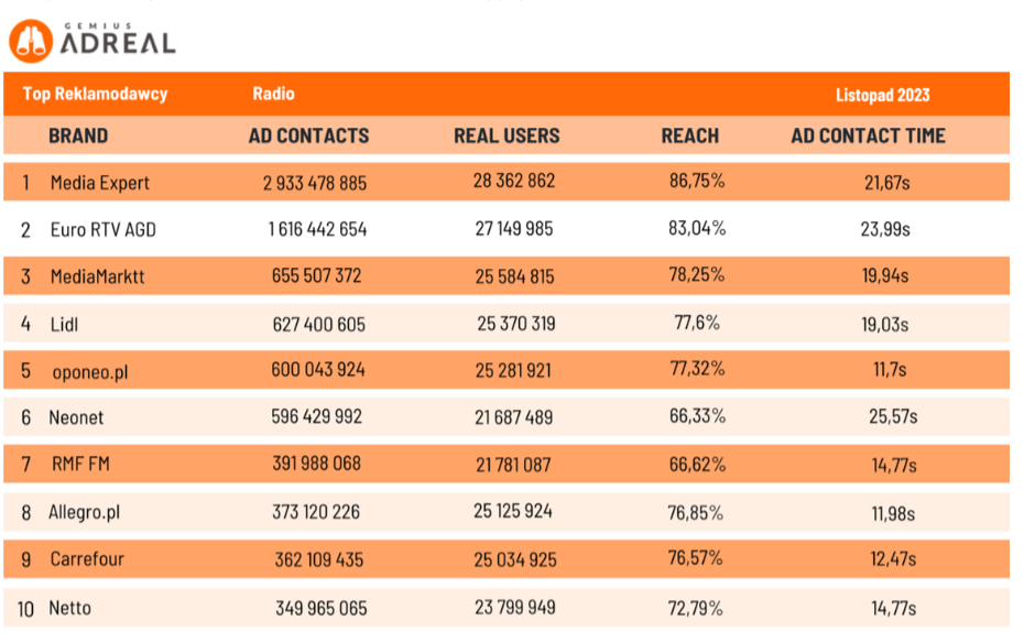 Najbardziej aktywnym reklamodawcą w radiu w listopadzie była ponownie marka Media Expert – wygenerowała ona 2,9 mld kontaktów reklamowych, docierając do 86,75% Polaków w wieku od 7 do 75 lat. Na drugim miejscu znalazło się Euro RTV AGD (1,6 mld kontaktów reklamowych, 83,04% zasięgu), na trzecim – MediaMarkt (0,66 mld kontaktów, 78,25% zasięgu). Zestawienie TOP 10 zamyka Netto (0,35 mld kontaktów i 72,79% zasięgu).