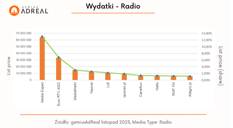 Najwyższy udział w wydatkach reklamowych w radiu miała w listopadzie marka Media Expert (12,89%). Kolejne miejsca należą do Euro RTV AGD (6,74%) oraz MediaMarkt (2,99%).