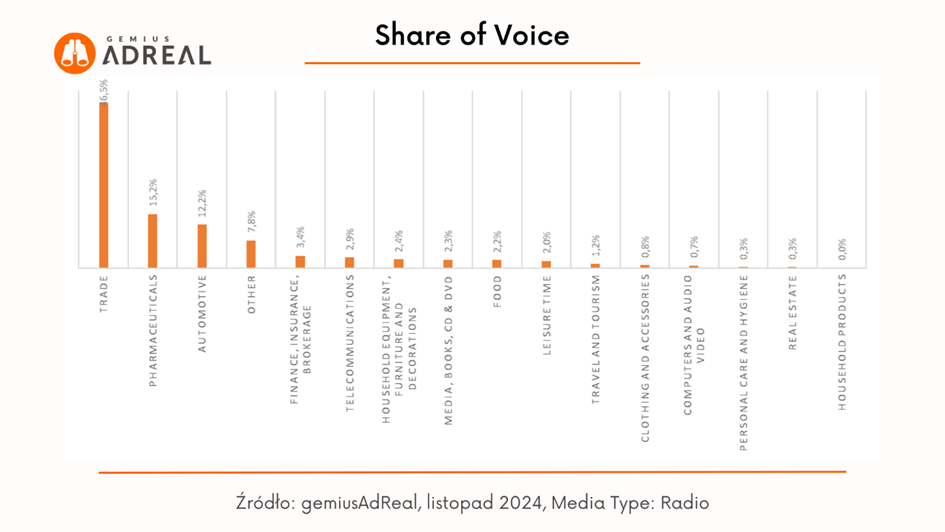 W radiu branżą o największej liczbie kontaktów reklamowych w listopadzie była branża „Trade” (12,99 mld). Na drugim i trzecim miejscu znalazły się branże „Pharmaceuticals” (4,24 mld kontaktów) oraz „Automotive” (3,40 mld kontaktów reklamowych).