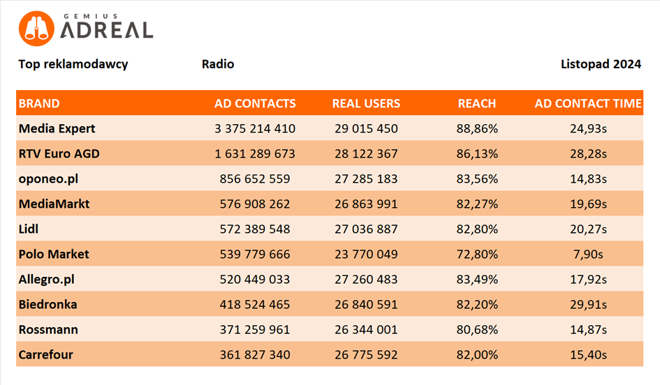Najbardziej aktywnym reklamodawcą w radiu w listopadzie była ponownie marka Media Expert – wygenerowała ona 3,37 mld kontaktów reklamowych, docierając do 88,86% Polaków w wieku od 7 do 75 lat. Na drugim miejscu znalazło się RTV Euro AGD (1,63 mld kontaktów reklamowych, 86,13% zasięgu), na trzecim – oponeo.pl (0,86 mld kontaktów, 83,56% zasięgu). Zestawienie TOP 10 zamyka marka Carrefour (0,36 mld kontaktów i 82% zasięgu).